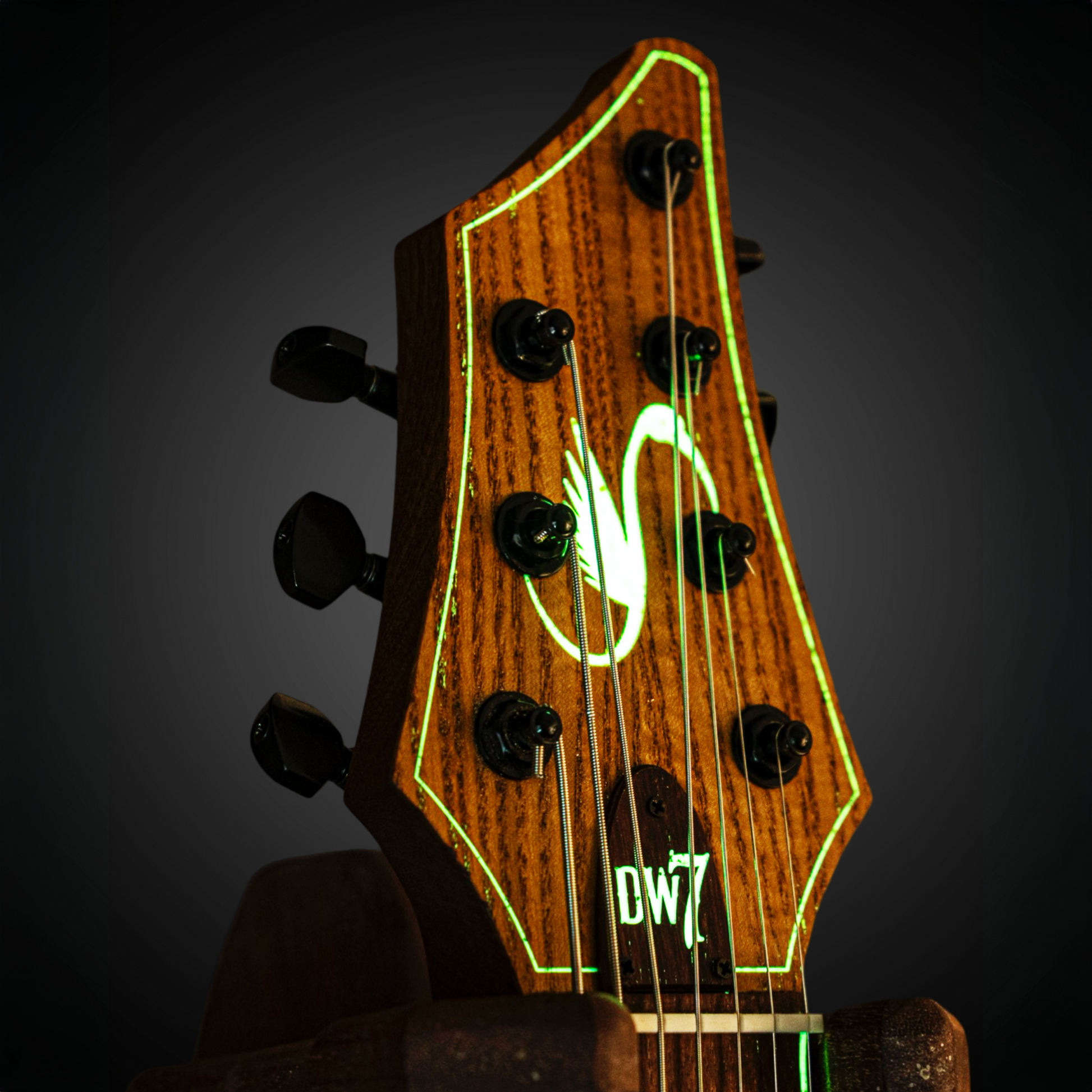 The “Dirty Glow” inlays illuminating the fretboard, headstock, and truss rod cover.
