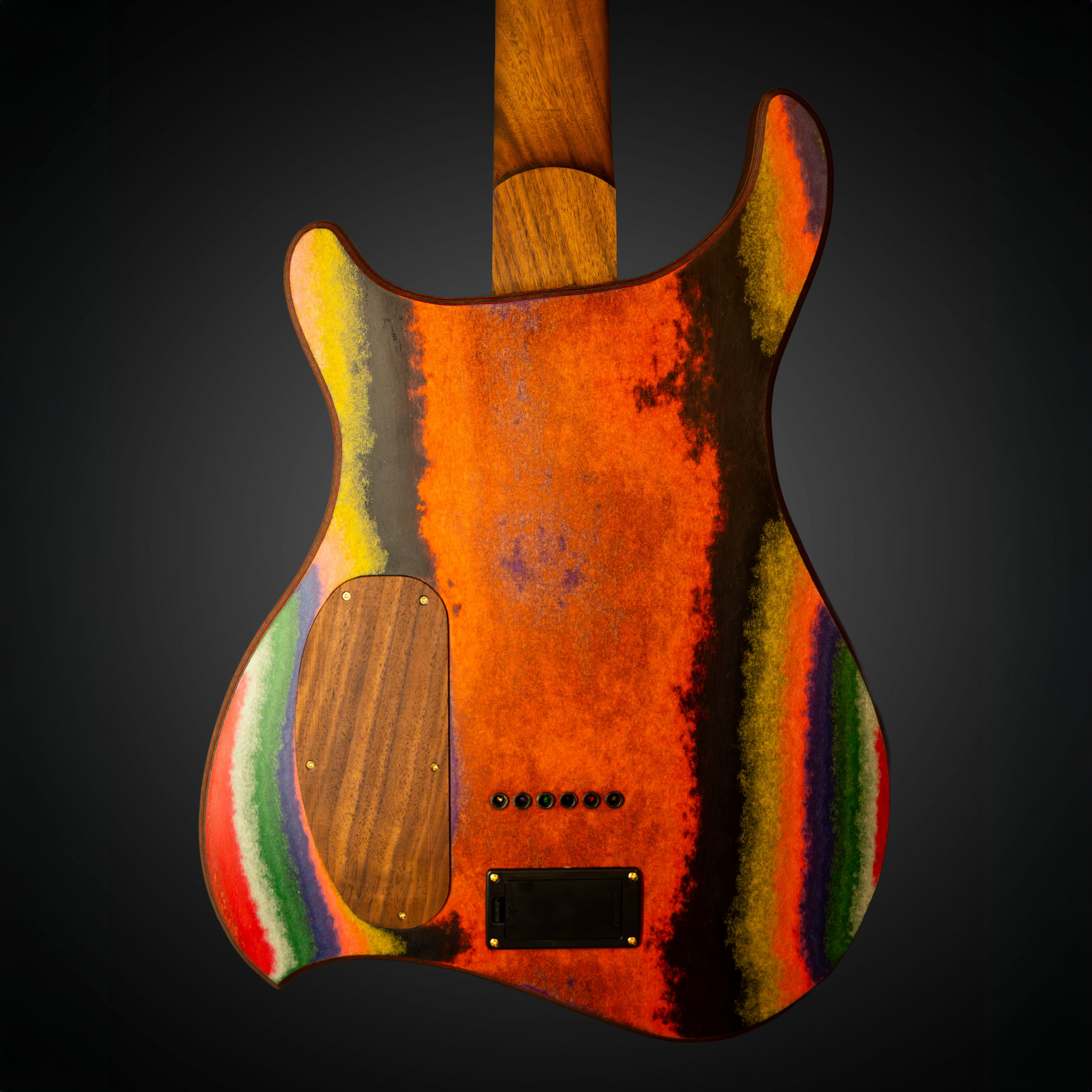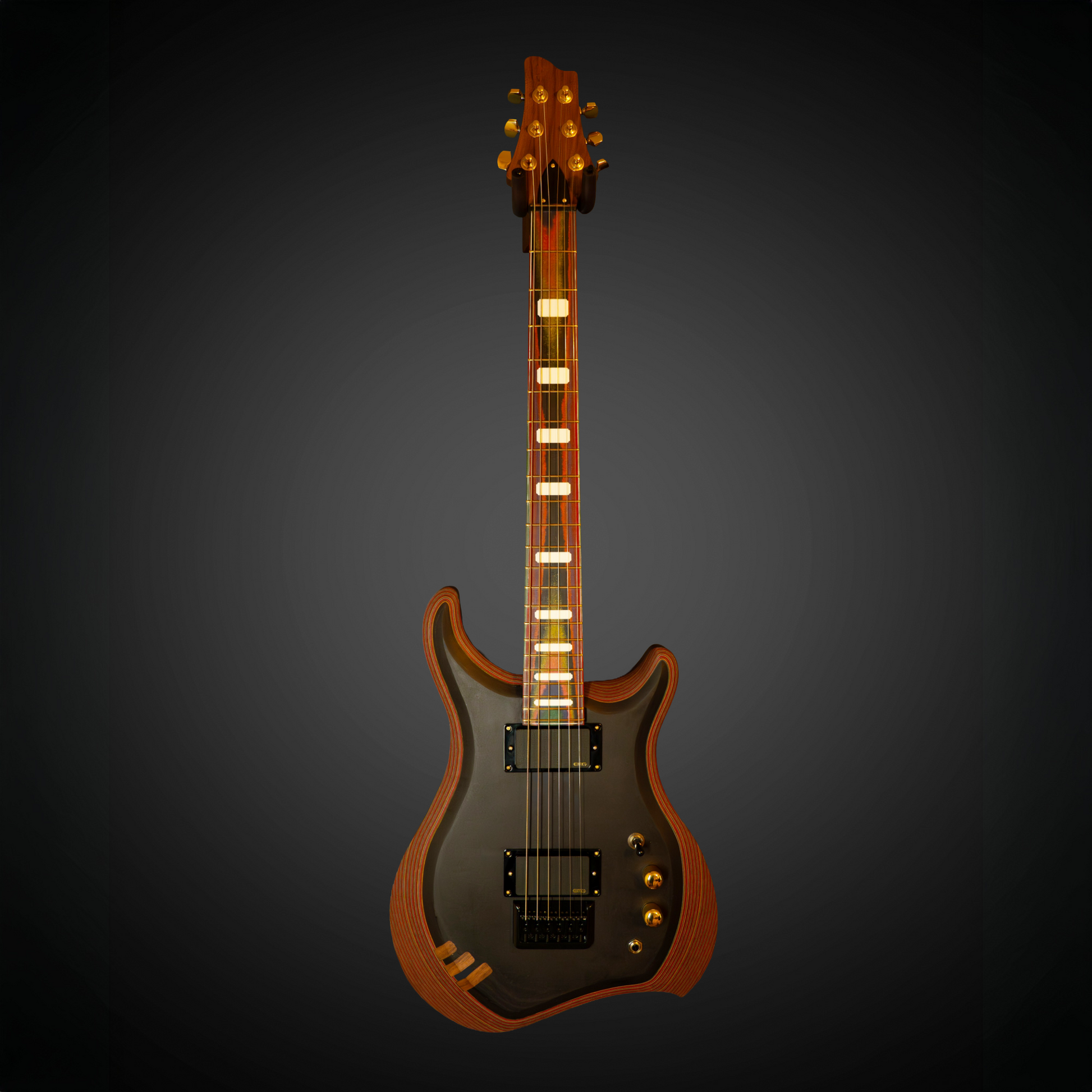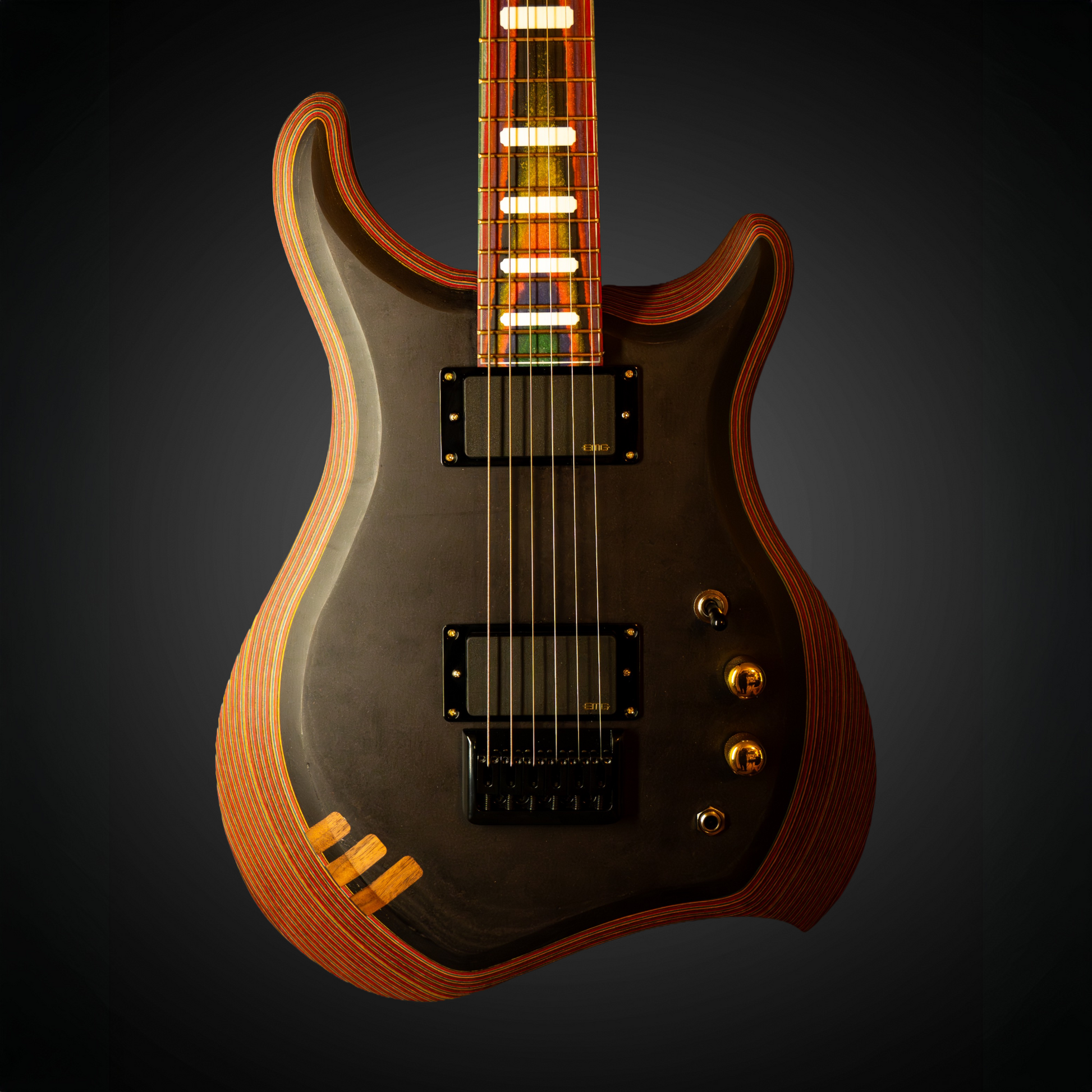 Custom made guitar featuring a micarta body, micarta fretboard along with walnut accents and walnut neck. All gold and black hardware with EMG 81's in the neck and bridge positions. The fretboard features white epoxy resin inlays that pop against the multi-colored micarta. The body is made of over 500 sheets of multi colored construction paper meticulously layered one piece at a time. The top is all black construction paper also layered one at a time with three walnut stitches to tie it all together.